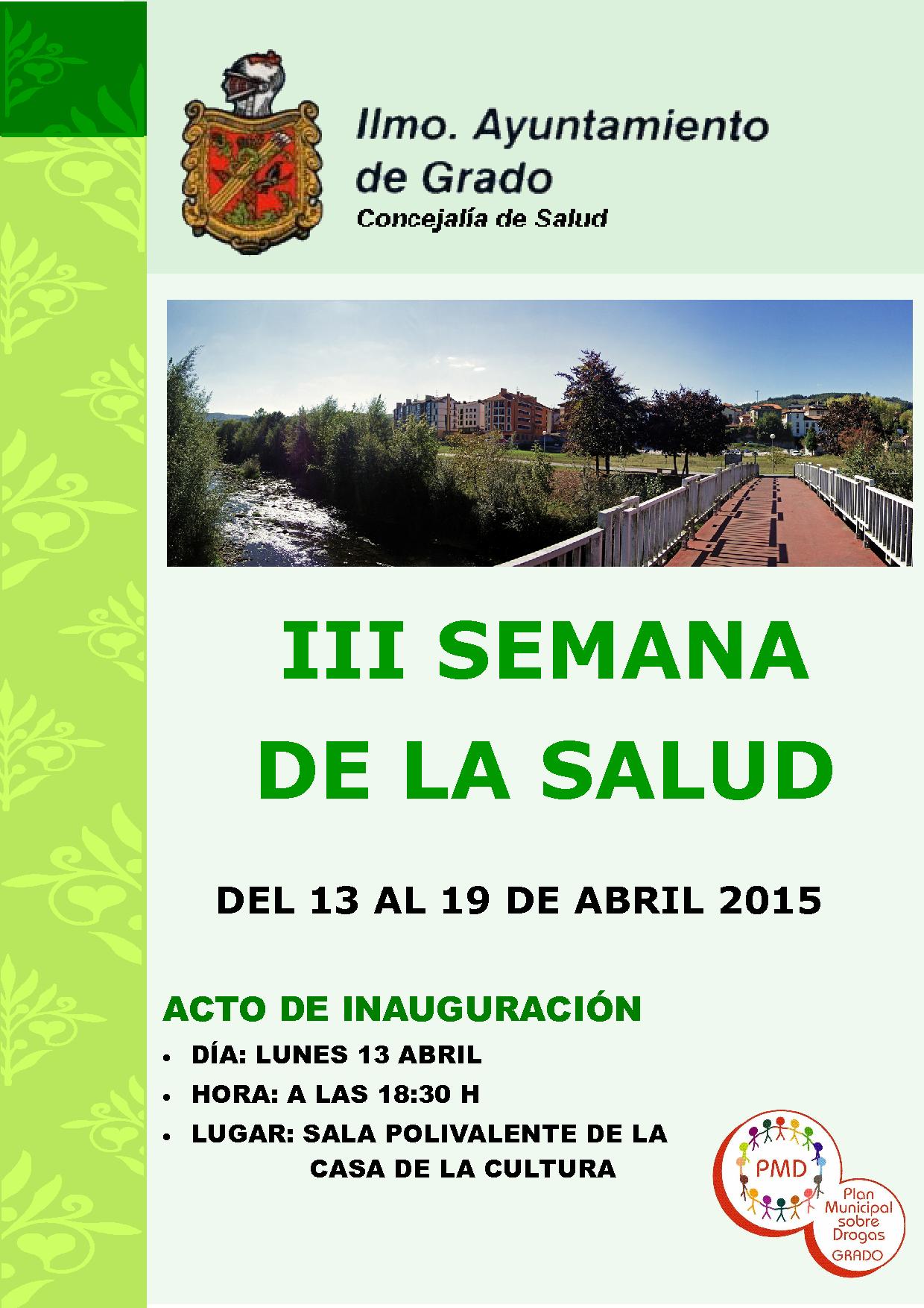 La III Semana de la Salud de Grado comienza hoy con un acto inaugural en la Casa de Cultura, seguido de la presentación del Programa Paciente Activo de Asturias (PACAS). Se prolongará hasta el día 19 de abril con un amplio abanico de propuestas pensadas para que pueda participar toda la población.